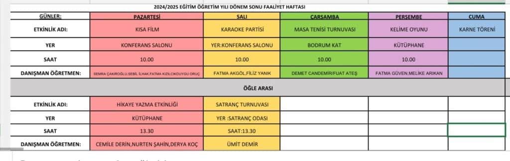Okulumuzda 2024/2025 eğitim öğretim yılı dönem sonu faaliyet haftası, öğrencilerimizin akademik yılın yorgunluğunu keyifli ve eğitici etkinliklerle atmalarını sağlamak amacıyla birbirinden renkli organizasyonlarla kutlandı.