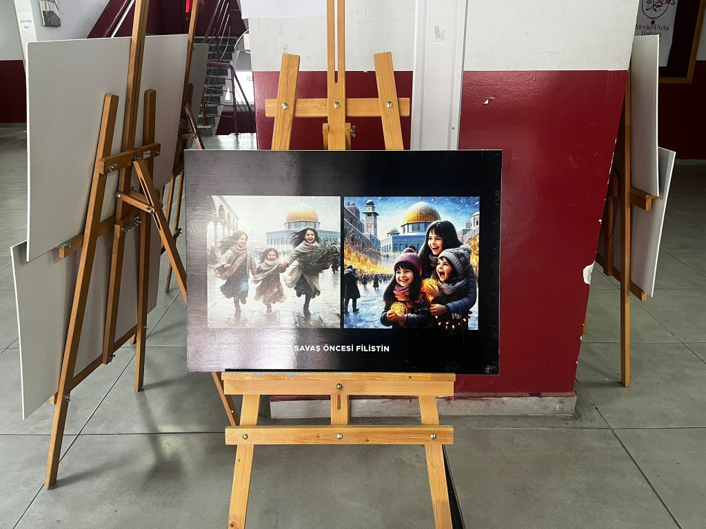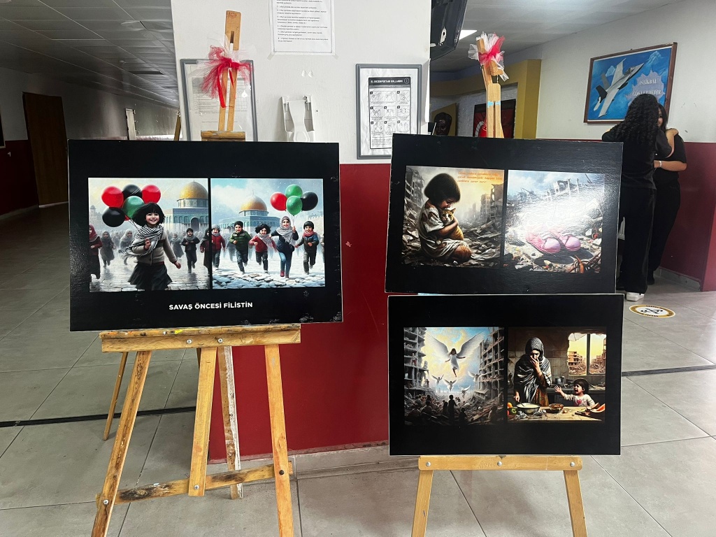 Okulumuzun girişinde, “savaş öncesi ve savaş sonrası Filistin” temalı görseller sergilenerek ziyaretçilere etkileyici bir farkındalık alanı oluşturuldu. Sergide yer alan görseller, öğrencilerimizin empati duygusunu güçlendirirken barışın kıymetini bir kez daha hatırlattı.